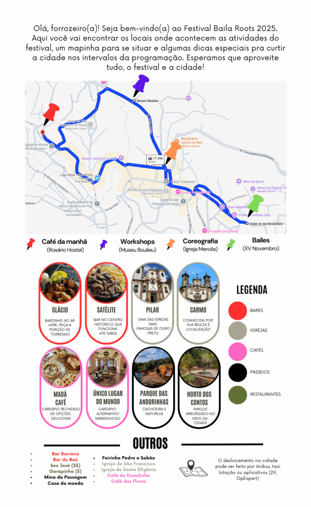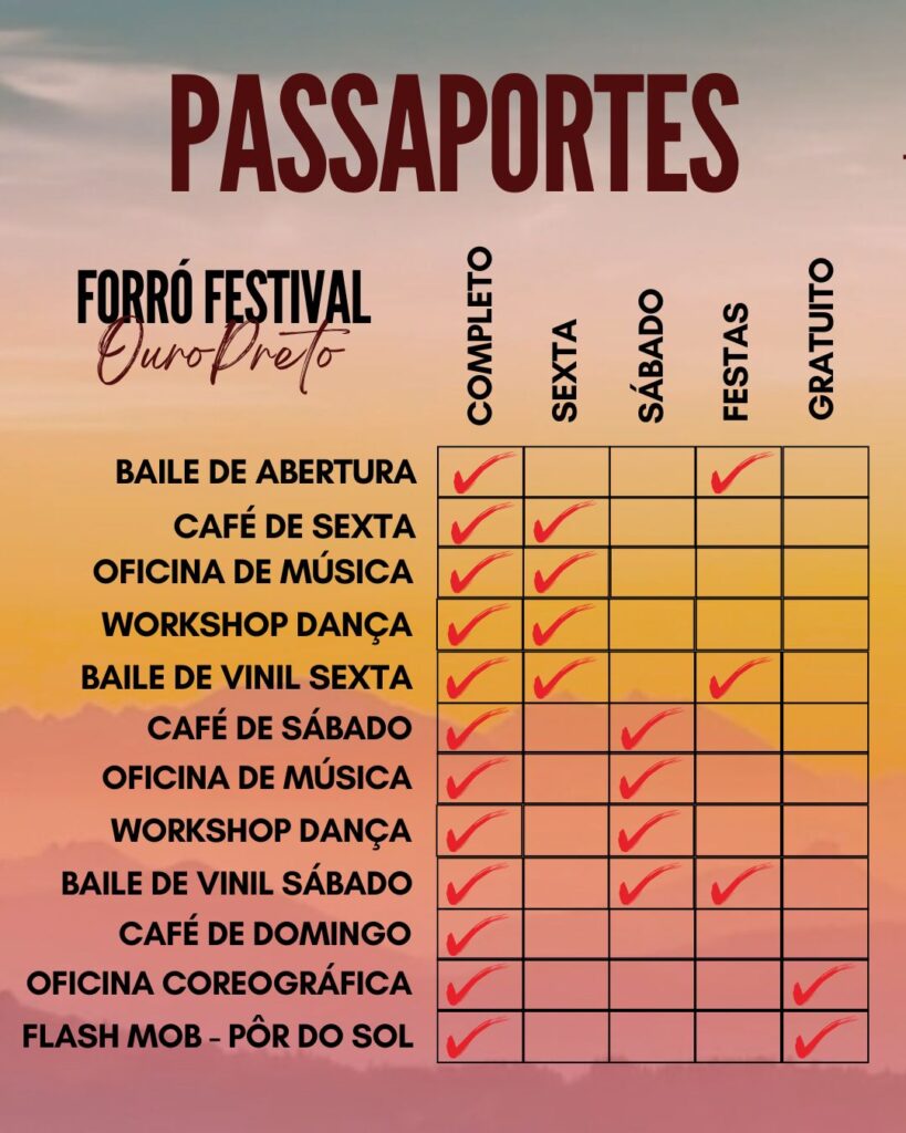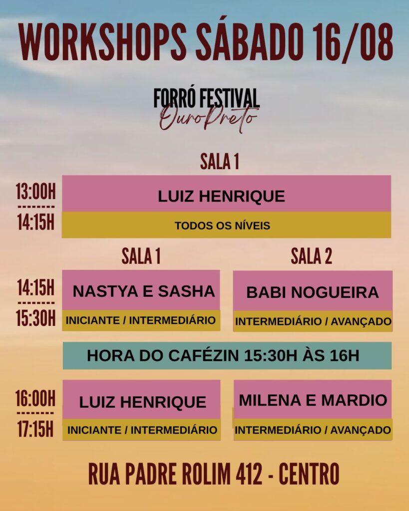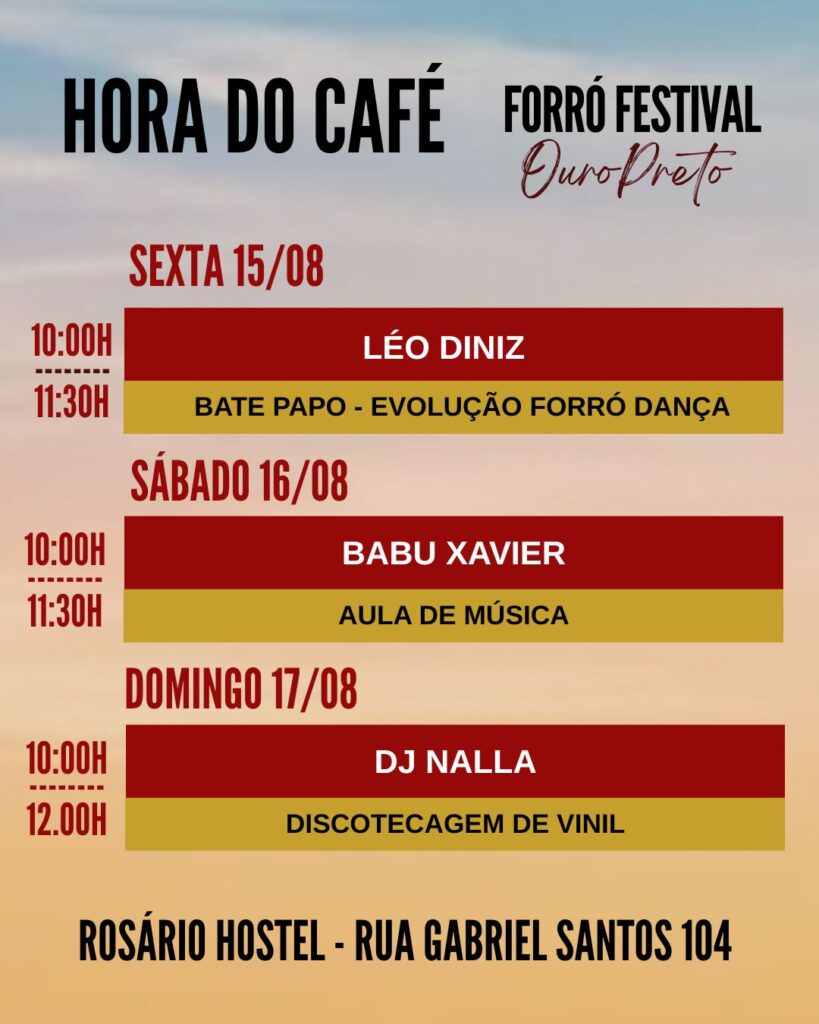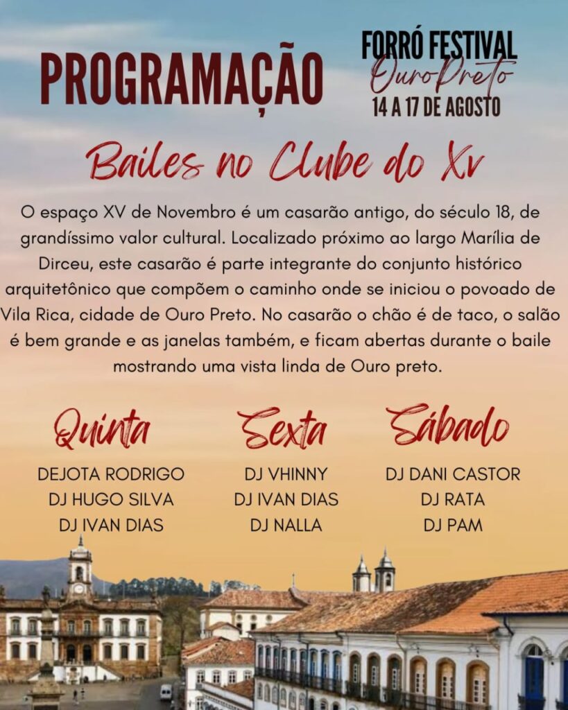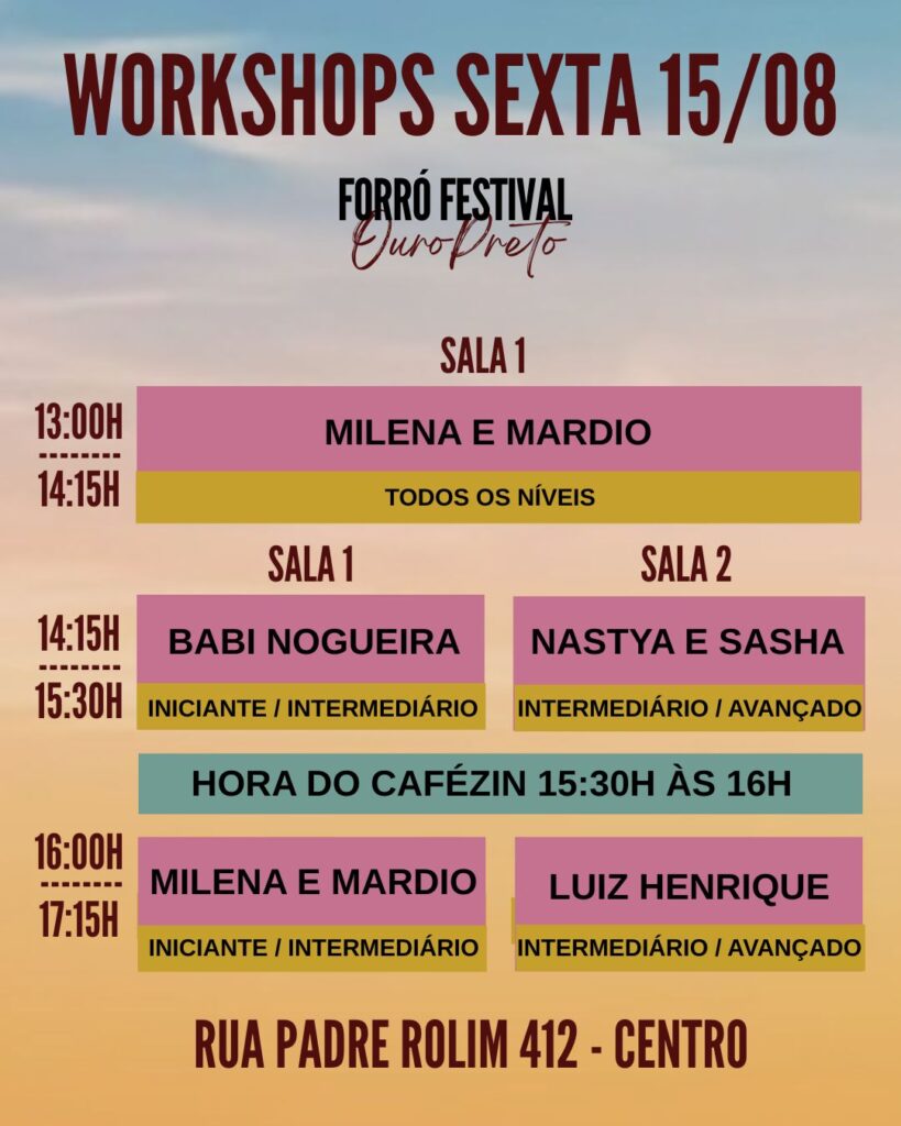 O forró vai tomar conta de Ouro Preto em um dos cenários mais incríveis do Brasil. Serão 3 bailes com DJs, 12 horas de workshops com professores renomados, oficinas culturais, cafés da manhã dançantes e até um flash mob pelas ladeiras históricas. Serão quatro dias pra viver, aprender e se conectar com a cultura. Vem com a gente!